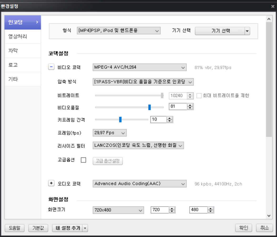 그러다가 코덱을 좀 더 살펴보면서 MPEG-4를 잠깐 공부하였고, 아래의 조건으로 인코딩을 하니 증상이 사라졌다. 그래, 코덱... MPEG-4가 아니라 H.264인거다. 맥 Super Video Converter에서도 코덱을 H.264로 바꾸니 키프레임 설정없어도 된다. (H.264 역시 MPEG-4계열이다. 정확히는 MPEG-4 10part 또는 MPEG-4AVC) 코덱 좀 안다고 마눌님께 까불거리다 생긴 일이긴 하지만, 그동안 사이트(E학습터) 개발/관리자들은 교사들을 영상 전문가로 인지하고 계신건 아닌지 싶다. 그리고, 영상을 제작하고 문제없이 올리는 쌤들은 도대체 이런걸 잘 알고 올리시는 걸까? 사이트 담당자들은 이런 쌤들을 경험해서일까? (메뉴얼 좀 제대로 만들어 주시라!!!)
