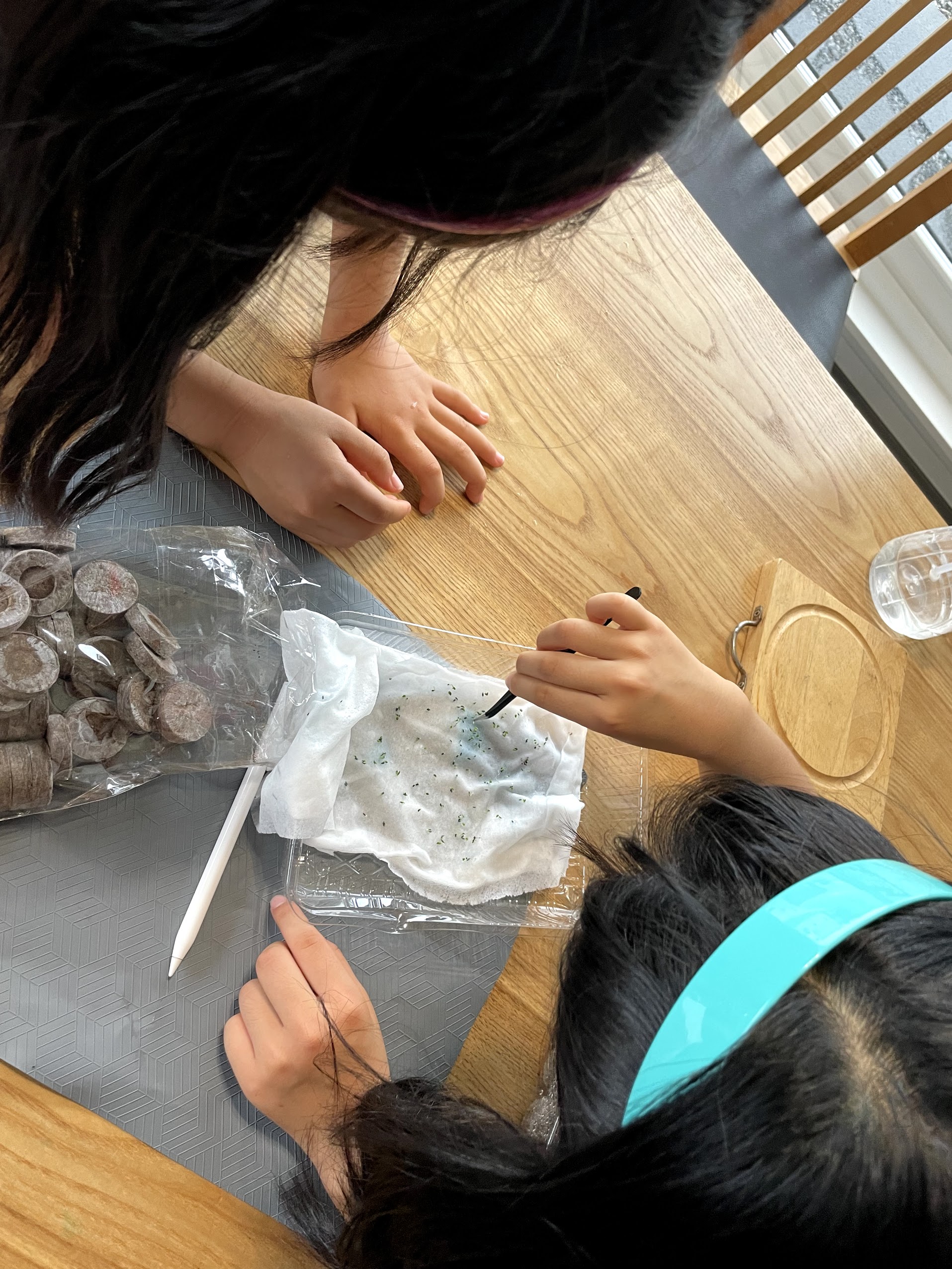 7월 6일 솜(물티슈)파종을 한 톱풀(야로우)이 먼저 나왔다. 날 수로는 3일이지만 이틀하고 반나절 정도 걸린 듯. 그런데 물티슈 파종의 단점은 이렇게 작은 씨앗의 경우 물티슈 조직에 뿌리가 엉켜서, 핀셋을 조금 쎄게 할 경우 뿌리와 줄기, 잎이 바로 분리된다는 점이다. 마침 귀가한 아이들이 즐겁게 지피펠렛에 옮겨심기 중.