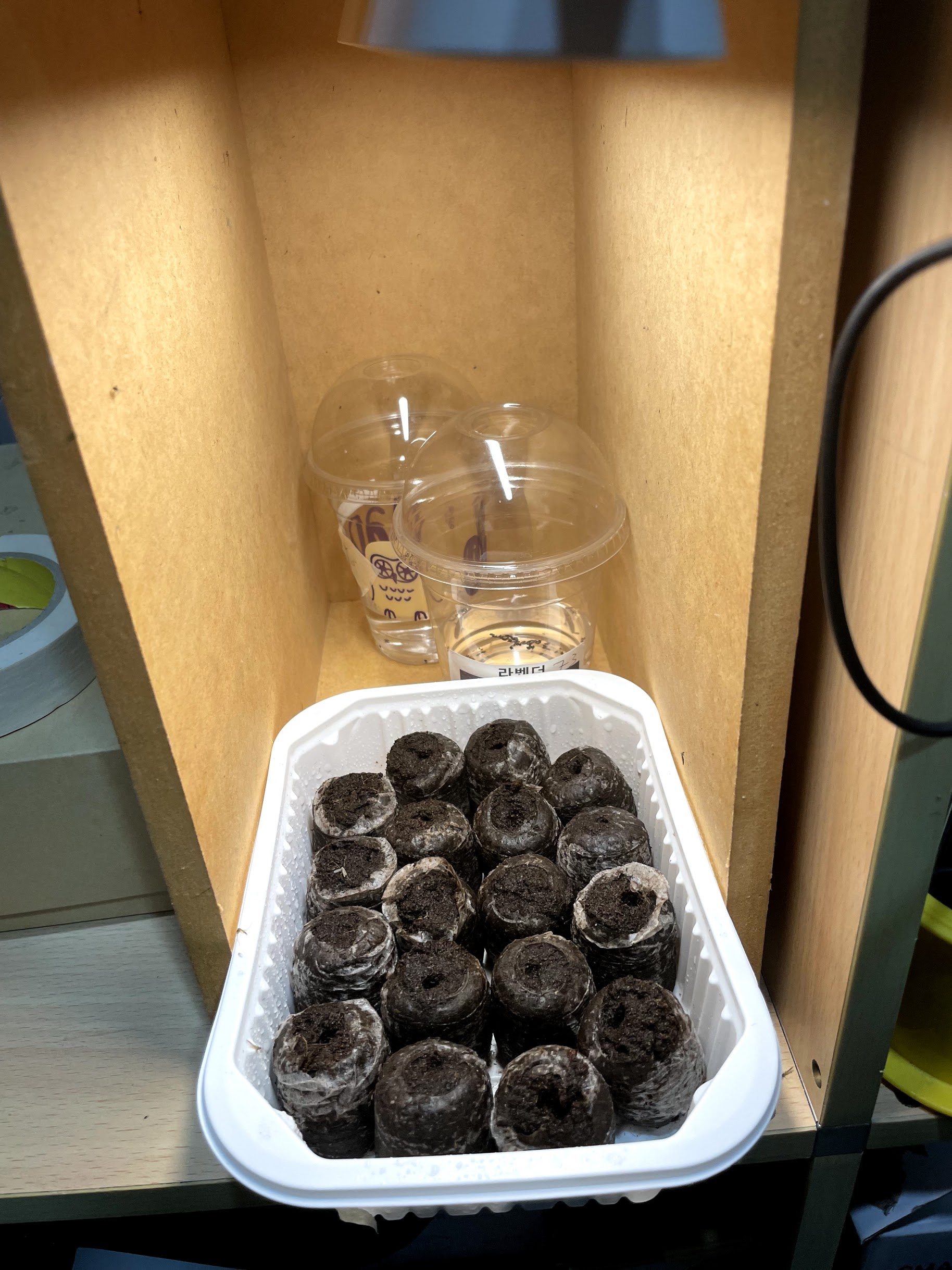 광발아에 사용하는 LED등은 BASEUS제품의 5W 데스크용 무선등인데, 자석이 달려서 자체 제공의 거치대 뿐만 아니라 철제 제품이면 모두 부착이 가능하다. 온도는 5000K(주백색)~3000K(백열등)으로 조절 가능하며 강한 빛으로는 4시간 정도 무선으로 사용 가능하다. 놀고 있던 컬러박스를 사용해서 라이트룸을 만들어 24시간 빛을 비춰주고 있다. 자... 누가 첫번째로 발아할 것인가...