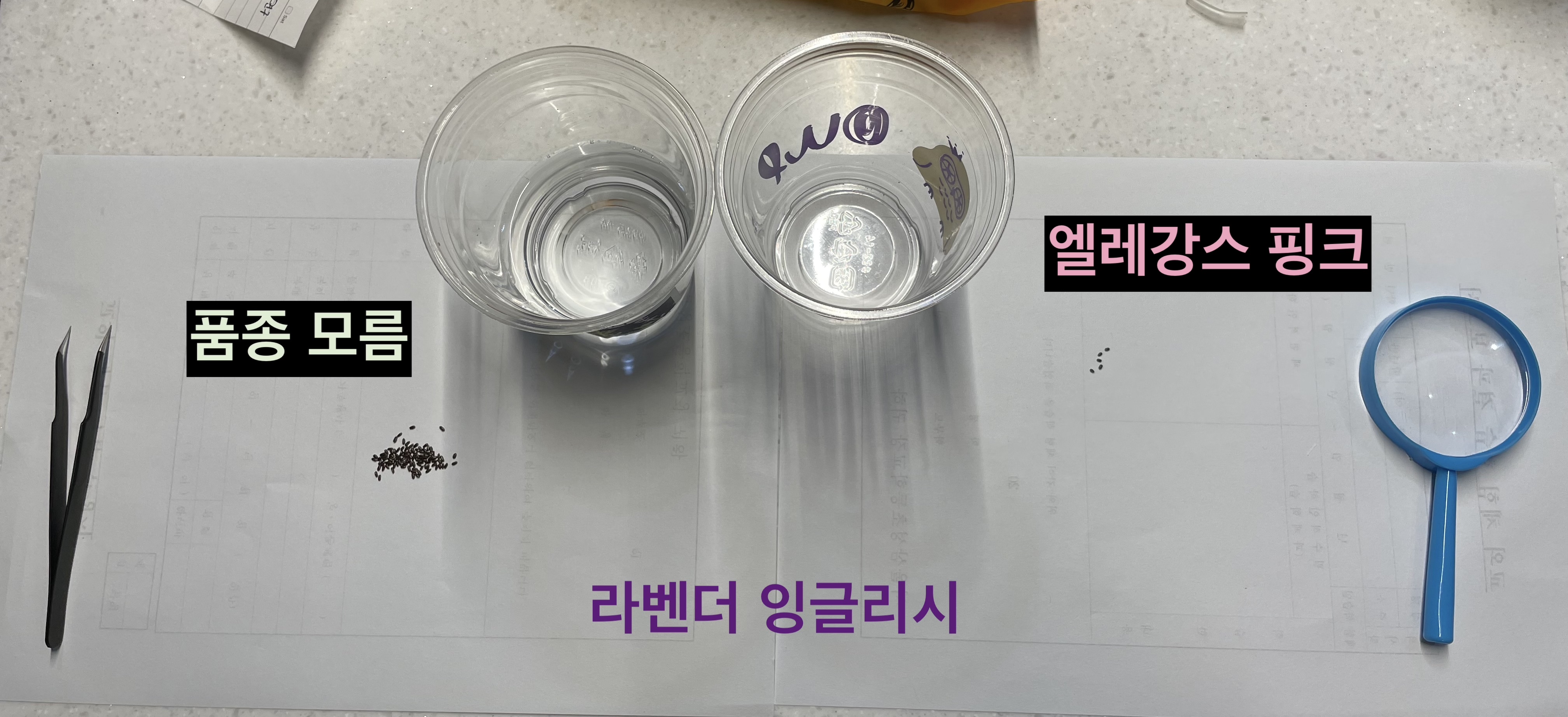 라벤더 들은 물파종이라는 방식으로 발아를 시도했고, 두 아이의 도움을 받아 잘 담궜다.