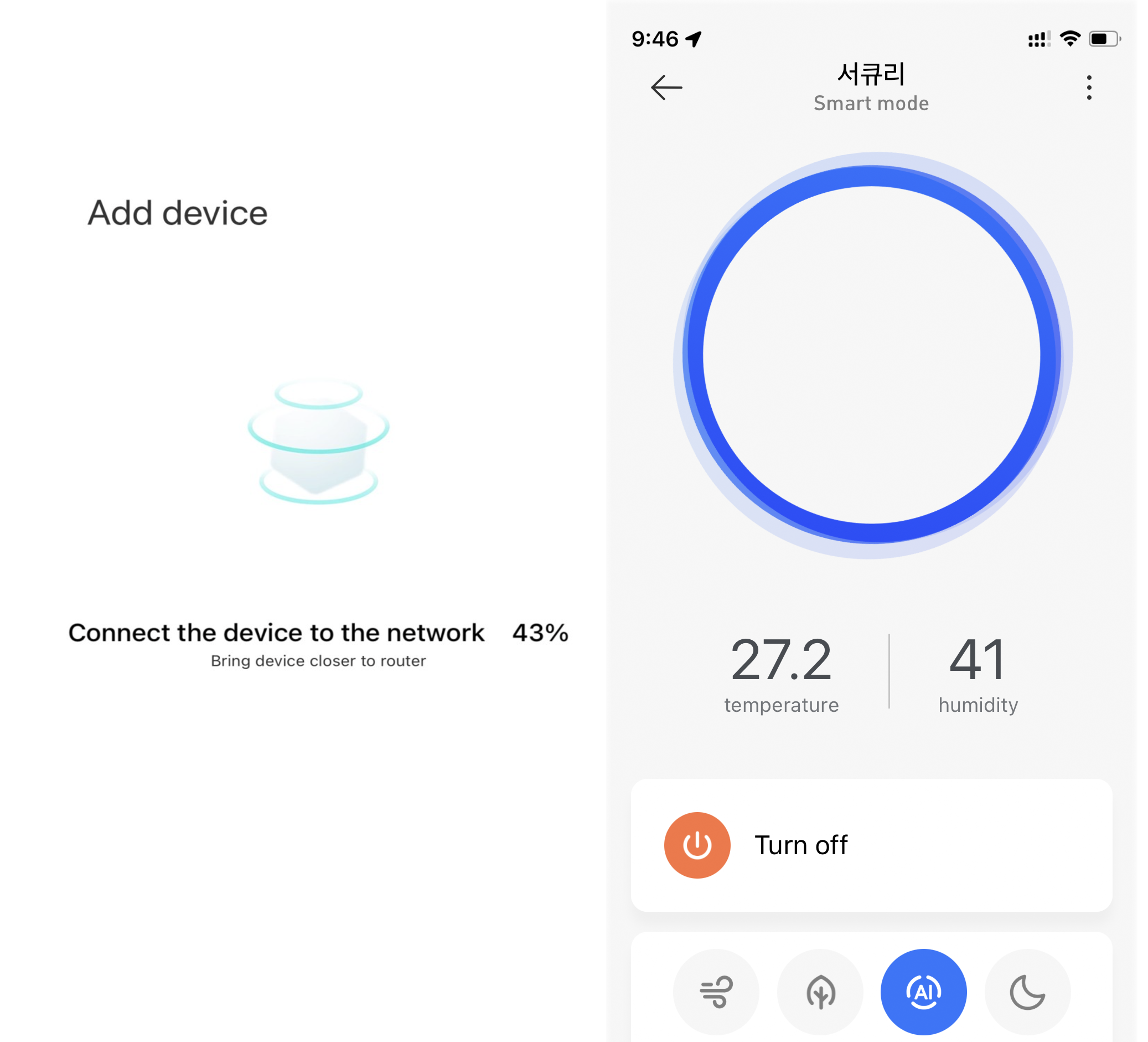 설정이 되면, 선풍기 Wifi에는 파란색 LED가 들어온다. 그런데 ... 저 온도... 뭐냐? 하고 집 온도계를 살펴보니, 대략 저 온도다. 실내 온도가 생각보다 높은데, 사실 체감 온도는 20도 전후의 서늘함이 있다. 어쨌든... 설치 끝.