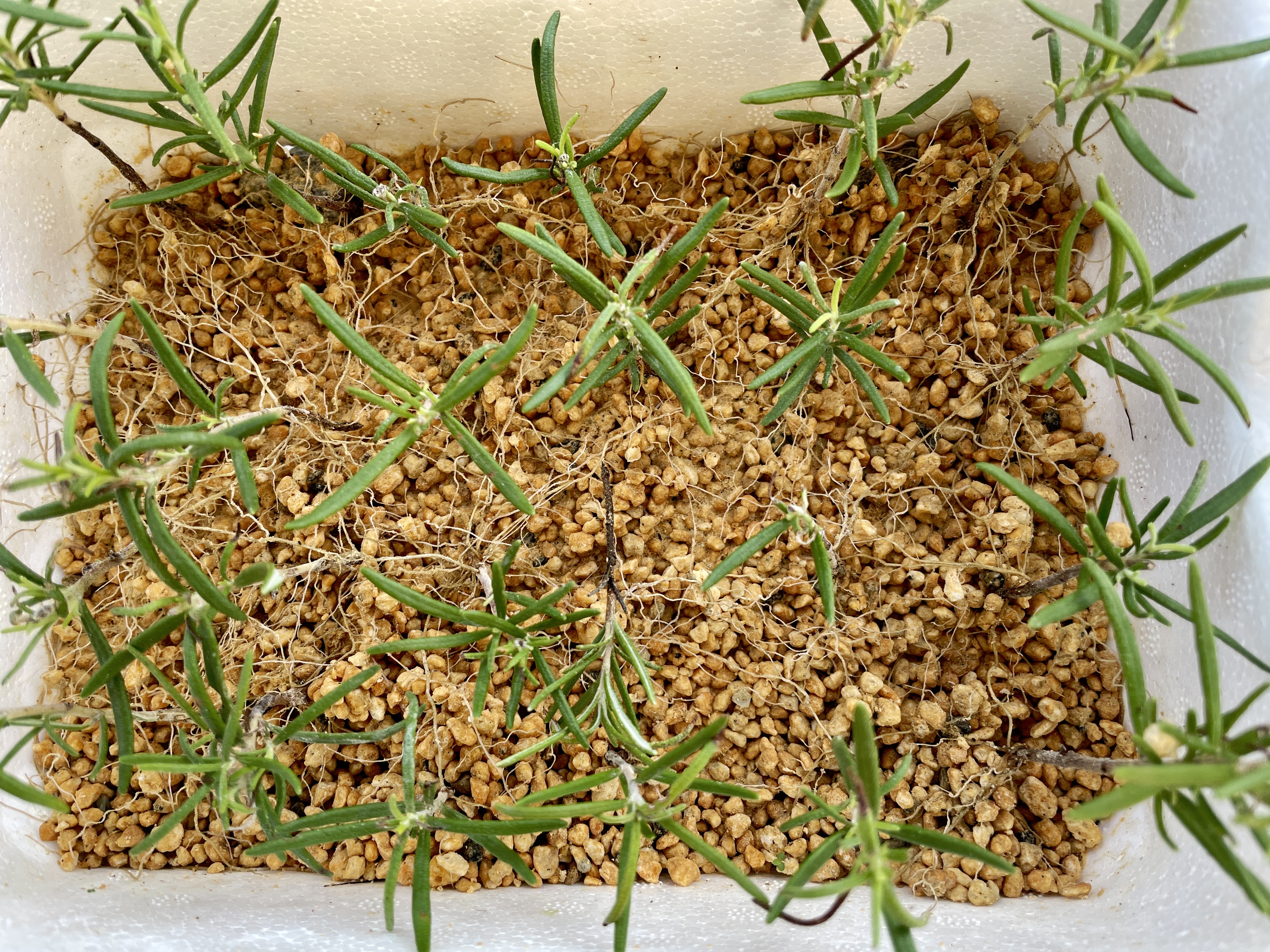 5월 중순 경, 로즈마리를 정리하면서 나온 가지들을 손질해서 꺾꽂이했다. 지난번에 마사토에 했던 것과 달리 녹소토를 구해 꺾꽂이용 흙으로 사용했다. 녹소토는 수분 흡수가 좋아서 꺾꽂이 삽목에 좋다는 글들을 여기저기서 봤었는데, 정말 잘 되더라. 그동안 먹었던 딸기 포장 스티로폼을 잘 모아뒀는데, 이것으로 꺾꽂이 삽목용 화분으로 사용했고, 삽목한 수는 대략 40주 정도였다. 그리고 지난 주에 절반 정도를 털었는데, 뿌리가 잘 나와서 다른 하나도 '조만간' 생각만 하다가, 오늘 오후 날씨가 좋아서 털었다. 어제(7일)부터 장마가 다시 시작이라고 했는데, 어제만 쏟아졌다. 오늘은 오전에 습기만 가득하다가, 오후엔 화창해졌고, 습기도 쓰윽 사라지더라. 지난 몇 달간 비가 안왔는데, 지난 주부터 오늘까지 딱 이틀간 하루 종일 내린 듯 싶다. 가뭄이 참 큰일이다.