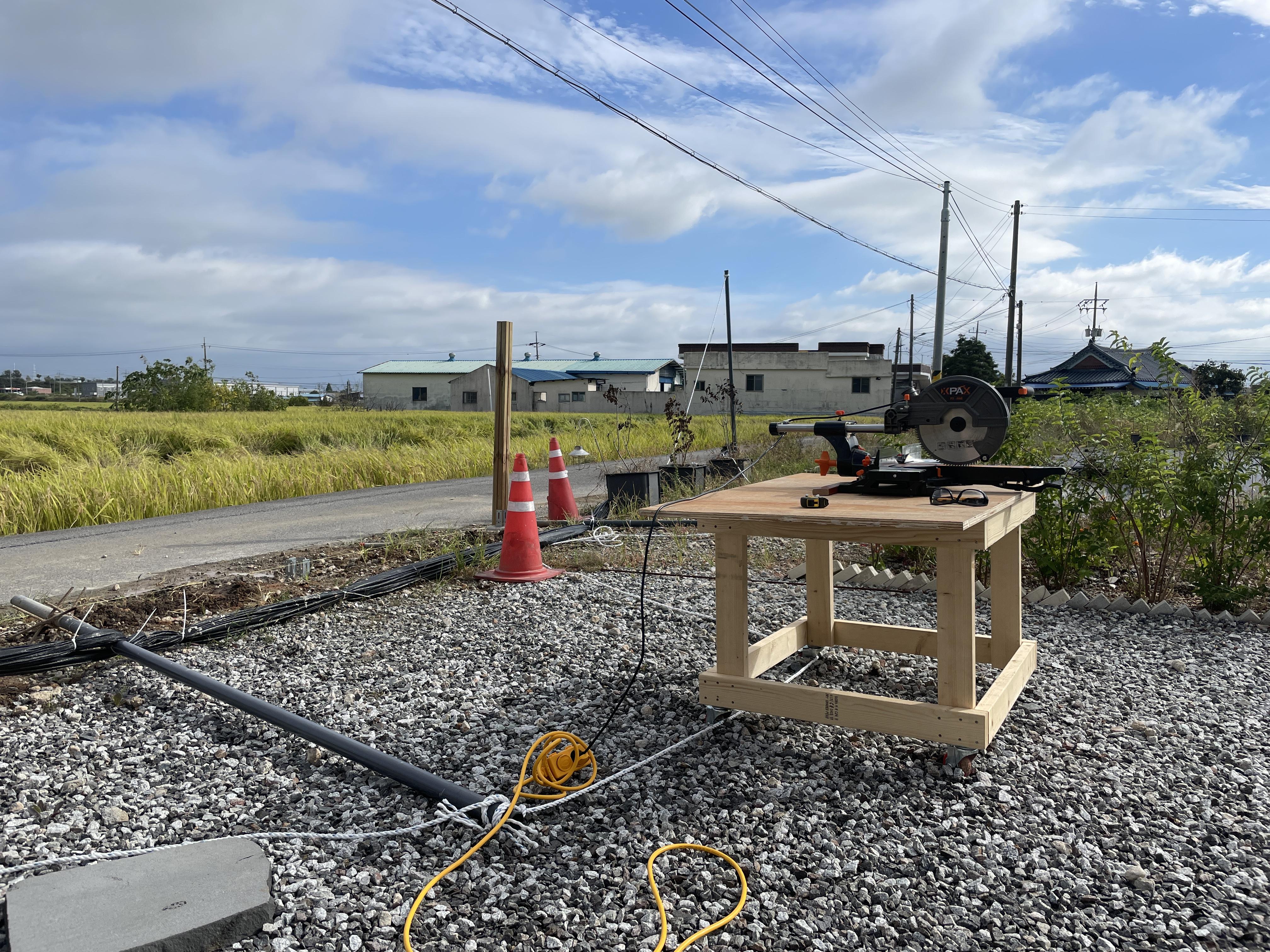 이틀이 지나고, 밤부터 내린 비가 오전(10.3)에 그쳤다. 아내와 잠깐 마실갔다가 돌아와서 수평과 기둥 높이를 맞춰서 임시로 가설해 보았다. 2~3cm 정도의 높이 오차가 발생한 부분은 내일 비가 오지 않으면 잘라낼 예정. 앞으로 남은 건 기둥에 가로바를 매입하기 위해 파내고, 그 위에 마감재로 정리할 예정.