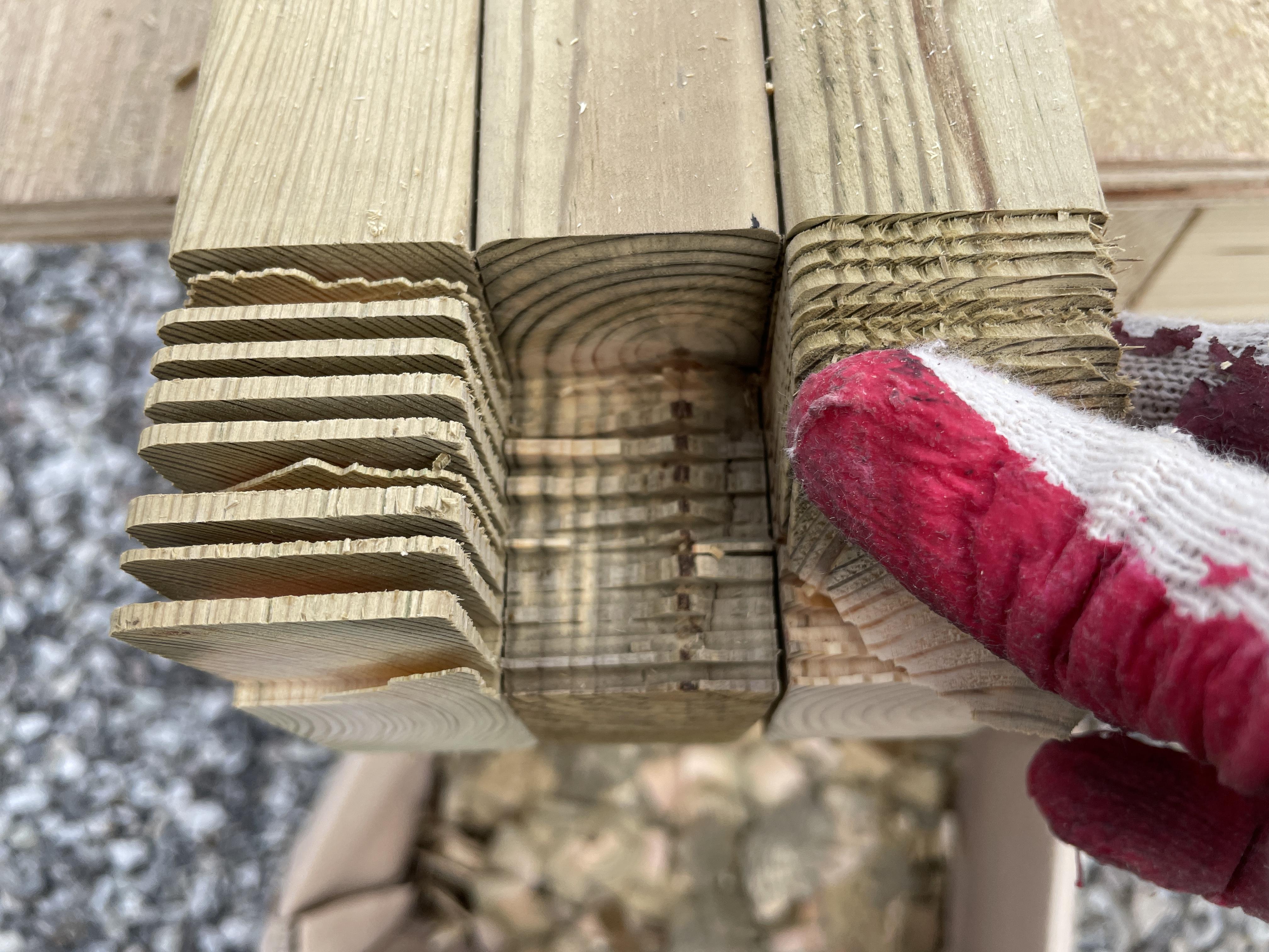 기둥은 앞 뒤로 삽입할 가로재들을 위해 땄다. 팍스 슬라이드 각도절단기의 단점은 톱날이 내려오는 높이가 깊은 편이어서 4X4 경우 깊이가 4Cm보다 얕을 경우 불가능하다. 따로 내려오는 부분을 조절하는 부위에 무언가를 받쳐야 되는데, 이 부분은 추후에 작업을 좀 해야 할 거 같다. 어쨌든 간신히 이걸 하였고, 무게 분산을 위해 세로재 역시 가로재에 맞닿는 부분을 땄다. 2X4로 가로재와 세로재를 만들었는데, 계획한 것보다 촘촘하게 배치하여 예상보다 많은 자재가 들어가고 있다. 48개의 세로재를 사용하니 6m담의 2/3정도가 채워졌다. 세로재 사이 간격은 55mm로 했는데, 보기에 좋더라.
