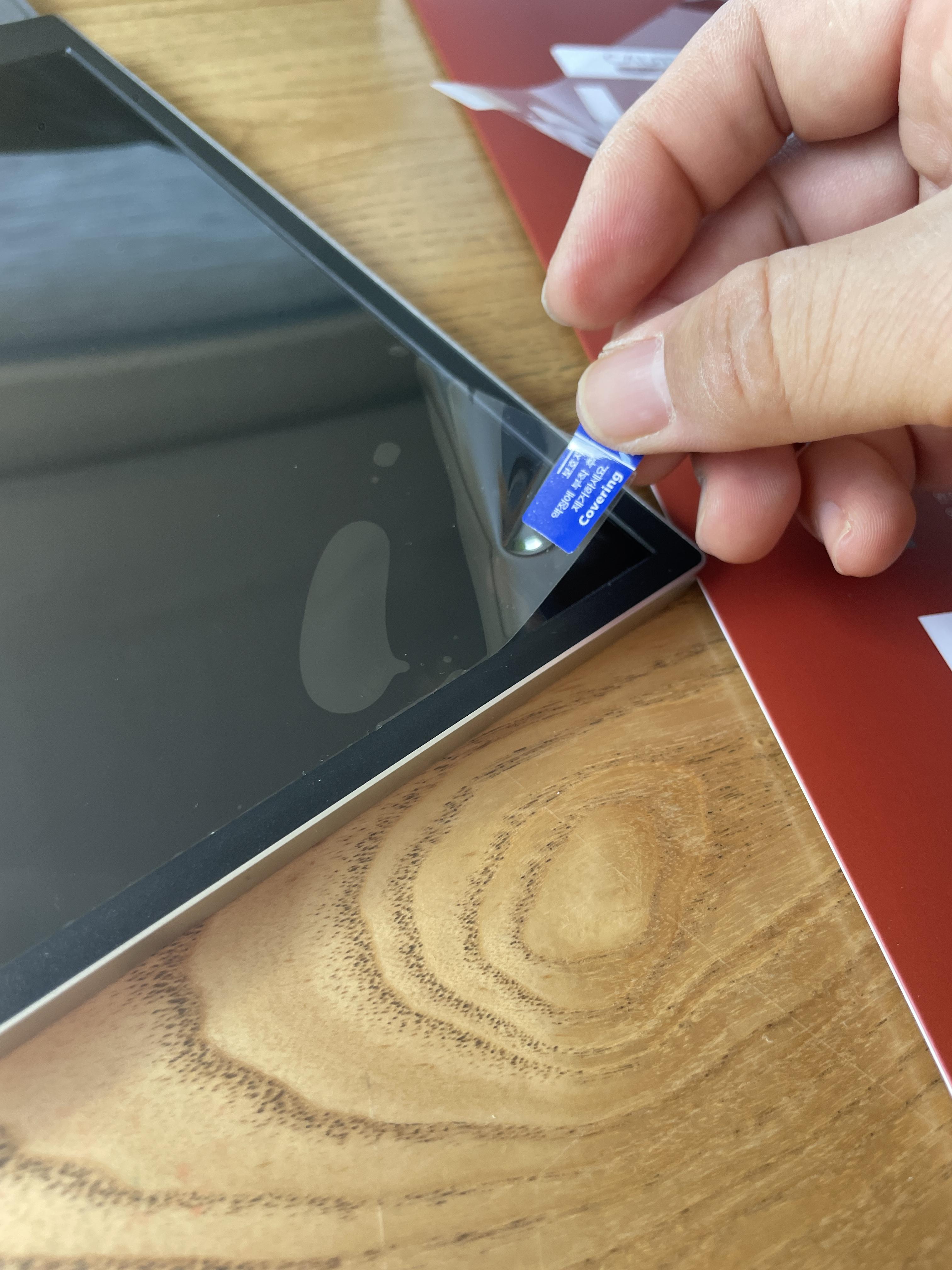 4. 커버1을 더 벗기면서 보호필름을 붙인다. 에어가 크게 들어가 있으면 다시 액정 필름을 들어올려 다시 붙인다.(액정필름이 약간 단단하고 접착면에 잘 밀착되어 붙는 편이어서 생각보다 기포가 많이 안 생긴다.)