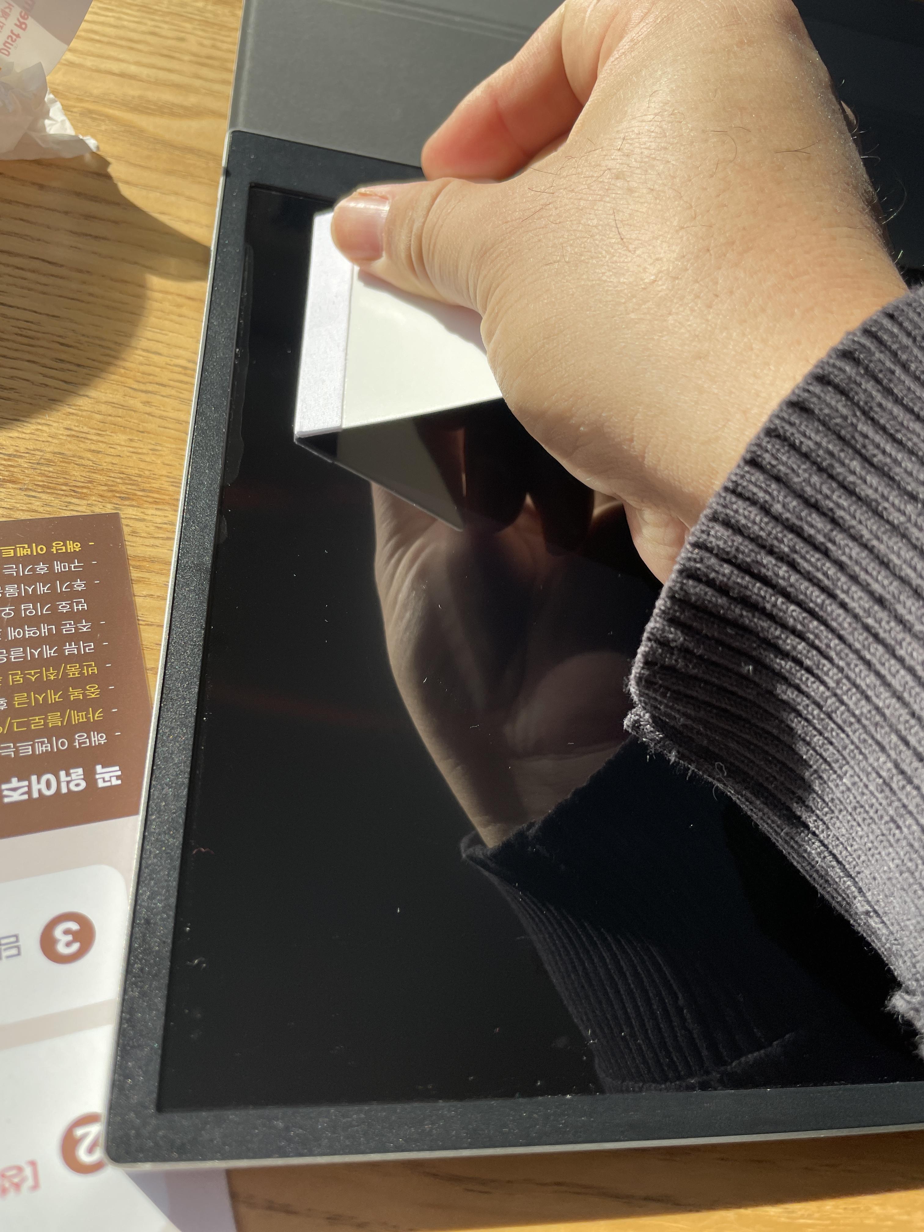 5. 다 붙이면 동봉된 헤라로 필름에 생겨있는 기포나 덜 붙은 필름끝들을 잘 문질러 붙인다. (생각보다 보호필름이 잘 들려서 기포를 빼는 작업이 어렵지 않았다.)
